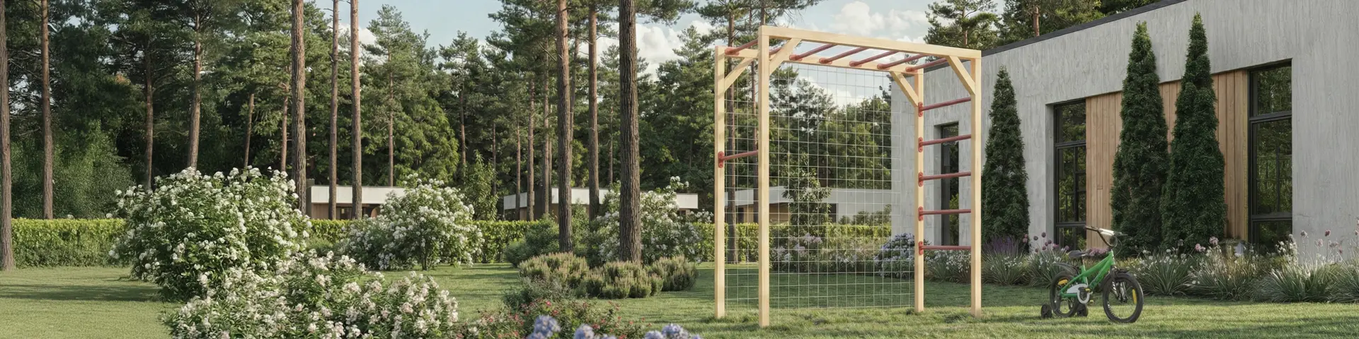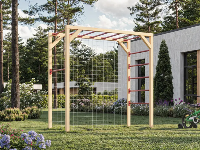 Ein Klettergerüst im Garten bietet Kindern einen sicheren Ort, an dem sie ihre motorischen Fähigkeiten stärken, wichtige körperliche Entwicklungsschritte machen und Spaß haben können.
