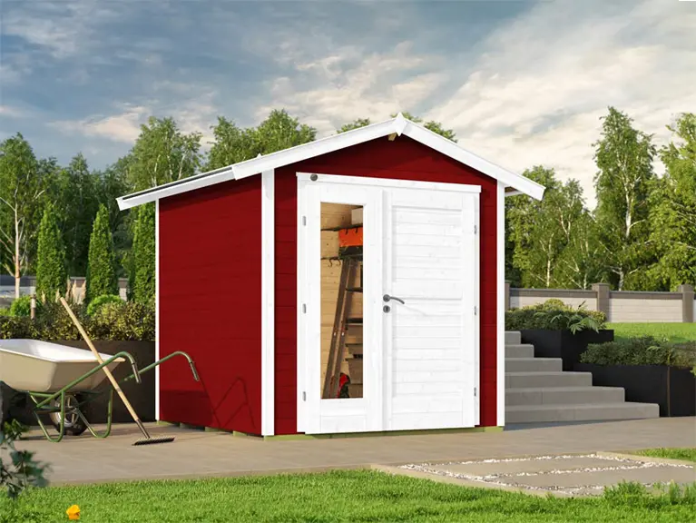 Unsere kleinen Modelle eignen sich ideal als Gerätehaus. Sie bieten Platz für Rasenmäher, Heckenschere, Schaufel oder Gartenschlauch. Trotz kompakter Grundfläche von etwa 2 m2 schützt die robuste Holzbauweise deine Geräte zuverlässig vor Witterung.