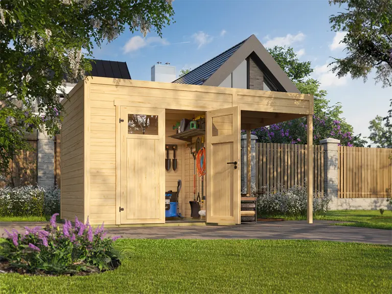 Geräteschuppen mit Boden sind besonders beliebt. Bei uns kannst du zusätzlich den haltbaren Massivholzboden aus europäischer Fichte erwerben, um deinem Gerätehaus weitere Stabilität und eine stimmigere Optik zu verleihen. Als Holzlager lässt sich ein Schuppen zudem mit einem Unterstand in Form eines Schleppdaches ergänzen.