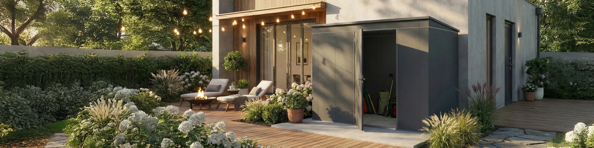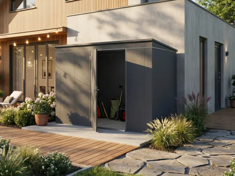 Gerätehäuser aus Metall in Anthrazit sind besonders beliebt, da die Farbe modern und zeitlos ist. Sie passt sowohl zu klar gestalteten, modernen Gärten als auch zu klassischen Außenbereichen und fügt sich harmonisch in unterschiedliche Umgebungen ein.