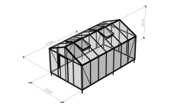 Bei diesem Modell sind 7 Glaselemente nebeneinander angeordnet. Bild zeigt Gewächshaus mit 6 Glaselementen.