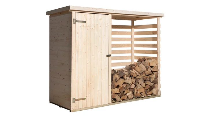 Das Brennholzlager Store 3 ist nicht nur ein ideales Holzlager, sondern bietet dir mit dem integrierten Schrank gleichzeitig Platz für deine Gartengeräte, Axt oder Werkzeuge.