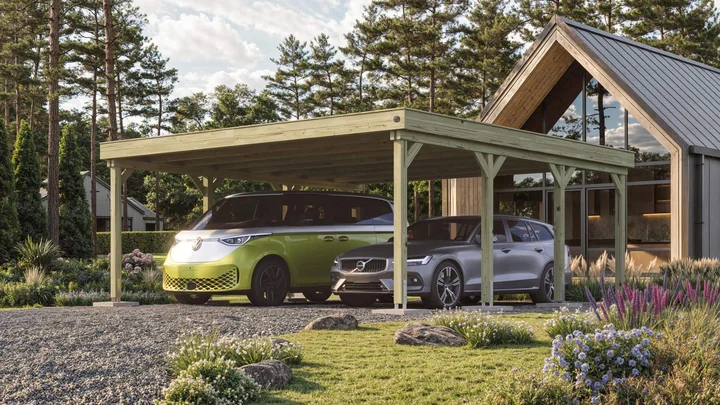 Der weka Carport 609 mit Stahldach und extra stabiler, freitragender Konstruktion schützt dein Auto zuverlässig vor Wind und Wetter. Da auf Zwischenpfosten verzichtet wurde, kannst du zwei Autos bequem einparken.