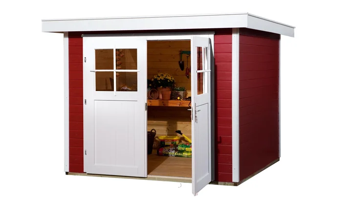 Das moderne weka Gartenhaus Blackmount 227 mit Flachdach ist perfekt für Blumenerde, Blumentöpfe, Gießkanne und Co. Die Lichtausschnitte in der Doppeltür lassen Tageslicht in den Innenraum und schaffen eine freundliche Atmosphäre. Außerdem kannst du deine Gartengeräte trocken und sicher verstauen.