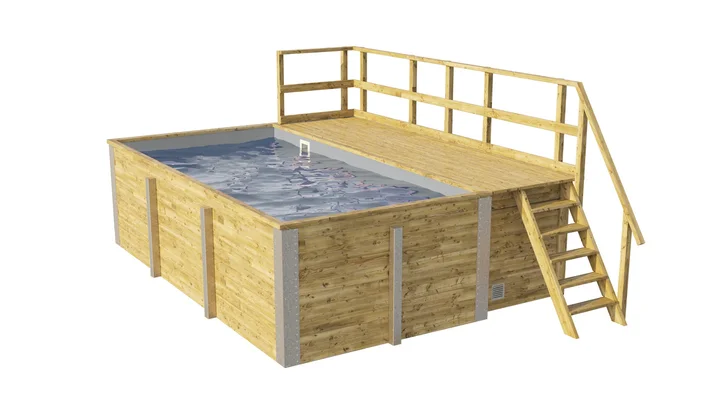 Im rechteckigen Massivholzpool 595 genießen Groß und Klein Spaß und erfrischende Abkühlung zugleich. Das Sonnendeck lädt nicht nur zu einer kleinen Pause ein, sondern überzeugt auch mit einem integrierten Technik- und Lagerraum – praktisch und platzsparend. Dieser Pool ist eine perfekte Kombination aus Funktionalität und Ästhetik, die dir viele Jahre Freude bereiten wird.