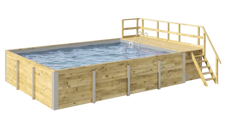 Im rechteckigen Massivholzpool 595 genießen Groß und Klein Spaß und erfrischende Abkühlung zugleich. Das Sonnendeck lädt nicht nur zu einer kleinen Pause ein, sondern überzeugt auch mit einem integrierten Technik- und Lagerraum – praktisch und platzsparend. Dieser Pool ist eine perfekte Kombination aus Funktionalität und Ästhetik, die dir viele Jahre Freude bereiten wird.