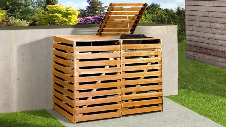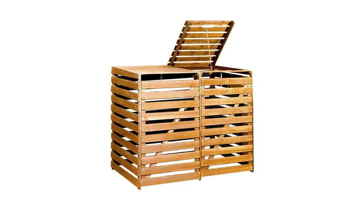 In der praktischen und stabilen weka Mülltonnenbox 196 verstaust du deine Mülltonnen direkt neben der Hofeinfahrt. Die Türen erleichtern das Verräumen der Tonnen – egal ob sie leer oder voll sind. Der aufklappbare Deckel ermöglicht dir außerdem das bequeme Befüllen. Die Box bietet Platz für zwei Tonnen und schafft Ordnung mit System.
