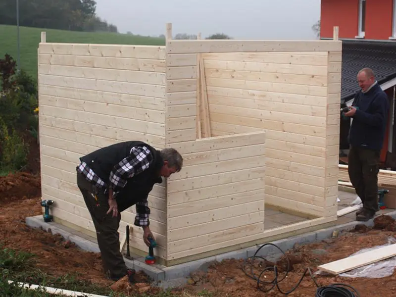 Als Sperrschicht gegen aufsteigende Feuchtigkeit kannst du Dachpappe oder die Verpackungsfolie verwenden. Je nach Untergrund empfehlen wir dir, das weka Blockbohlenhaus mit dem Fundament zu verankern – zur zusätzlichen Sturmsicherung. Prüfe vorher jedoch die absolut rechtwinklige Lage der Bodenbalken (Diagonale messen) und korrigiere diese so lange, bis die Werte gleich sind.