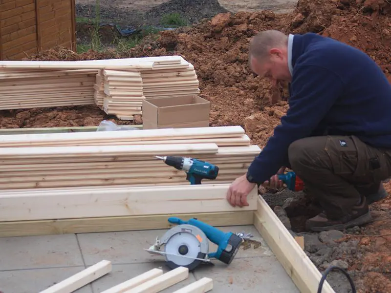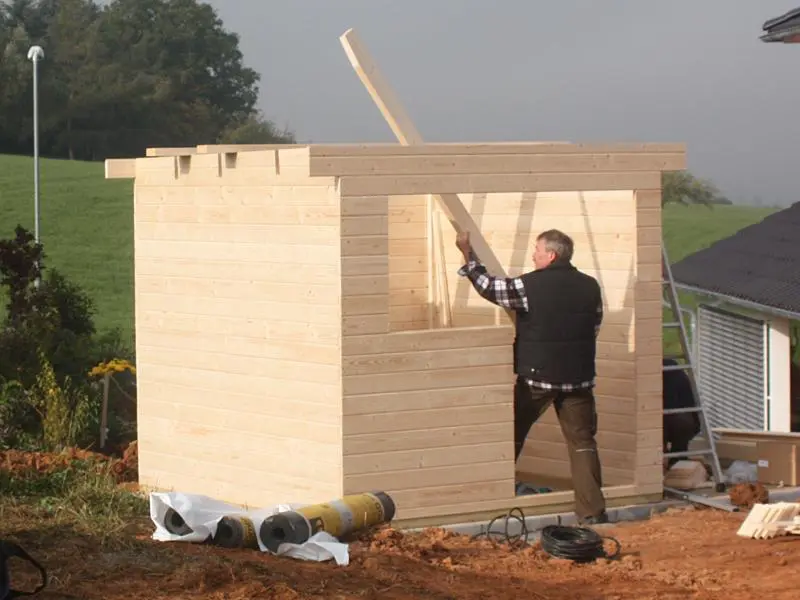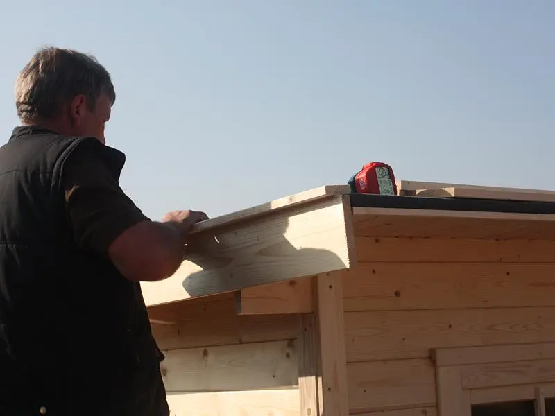 Beim Aufbau eines Blockbohlenhauses solltest du immer wieder kontrollieren, dass die Wandbohlen waagerecht sitzen.
