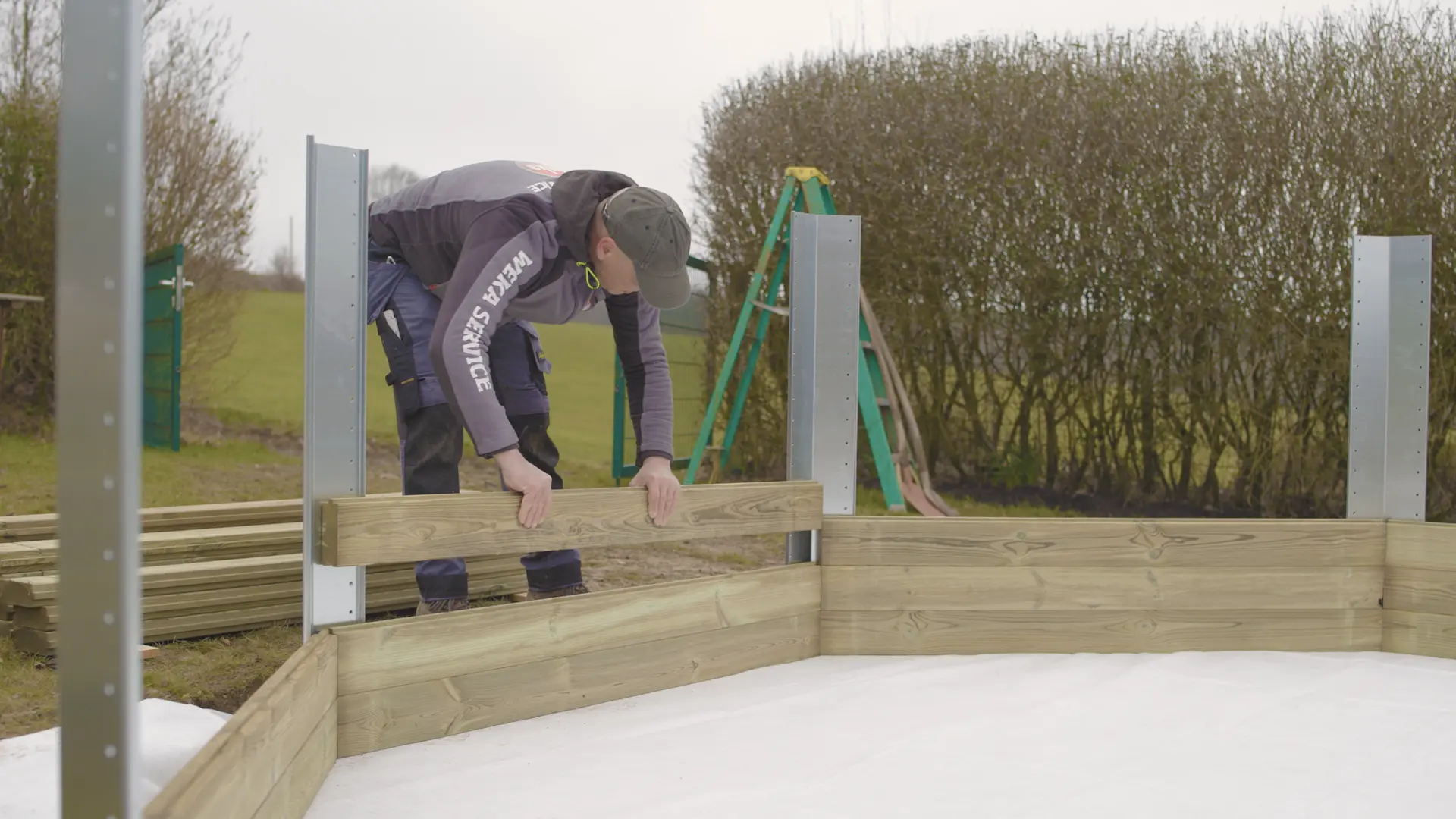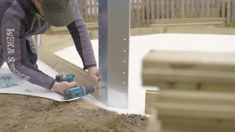 Setze die Wandbohlen ringsherum ein und verbinde die Ecken mit den Metallplatten. Kontrolliere zwischendurch, ob die Bohlen exakt und waagerecht verlegt sind.