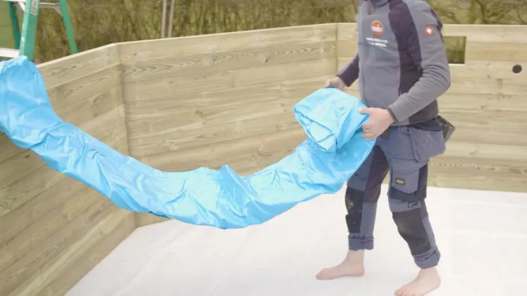Lasse etwas Wasser in den Pool, damit sich die Folie ausbreiten kann und du sie besser spannen und am Rand befestigen kannst.