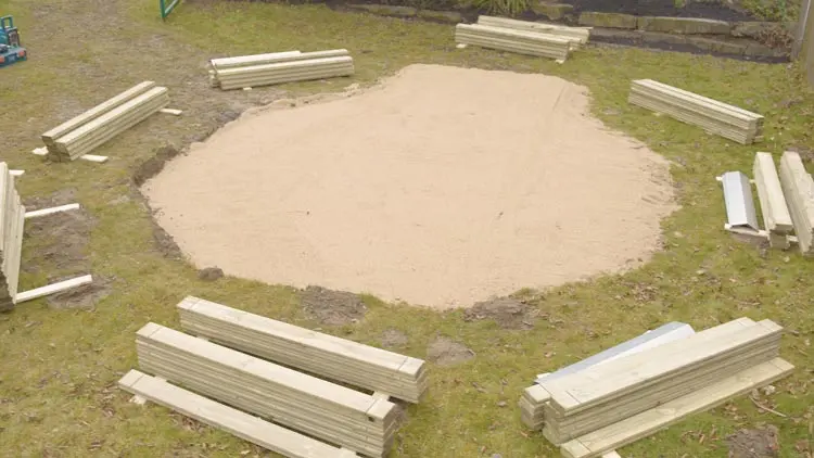 Positioniere die Bohlen an deinem Montageort und kontrolliere sie auf Vollständigkeit und Unversehrtheit.