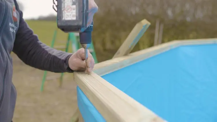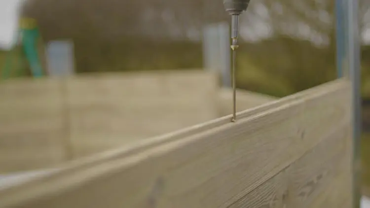 Verschraube die Wandbohlen miteinander. Achte unbedingt darauf, dass die Schrauben abwechselnd versetzt eingeschraubt werden, damit sie nicht aufeinanderstoßen.