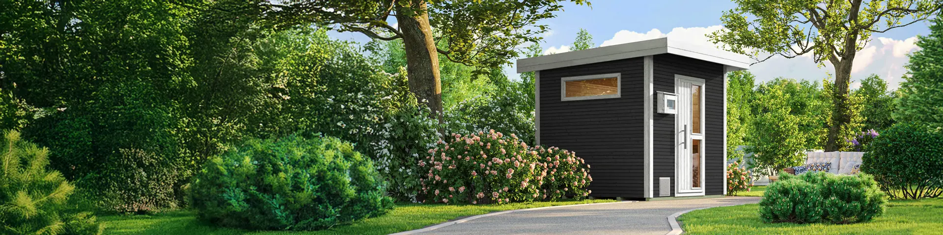 Für kleine Gärten oder wenn du meist allein oder zu zweit saunieren möchtest, eignet sich ein kompaktes Saunahaus für bis zu zwei Personen. Ein Saunahaus mit Flachdach wirkt modern und elegant, einige Modelle haben ein integriertes Fenster mit Blick in den Garten.
